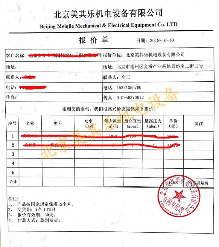 圖為我司北京美其樂機電設(shè)備正式報價格式