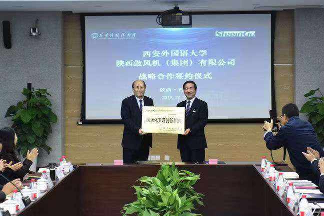 隨后,王校長和李董事長在與會代表的見證下簽署了《西安外國語大學(xué)-陜西鼓風(fēng)機(集團)有限公司戰(zhàn)略合作協(xié)議書》,并互授 “國際化實習(xí)創(chuàng)新基地”牌和“國際化人才聯(lián)合培養(yǎng)基地”牌。